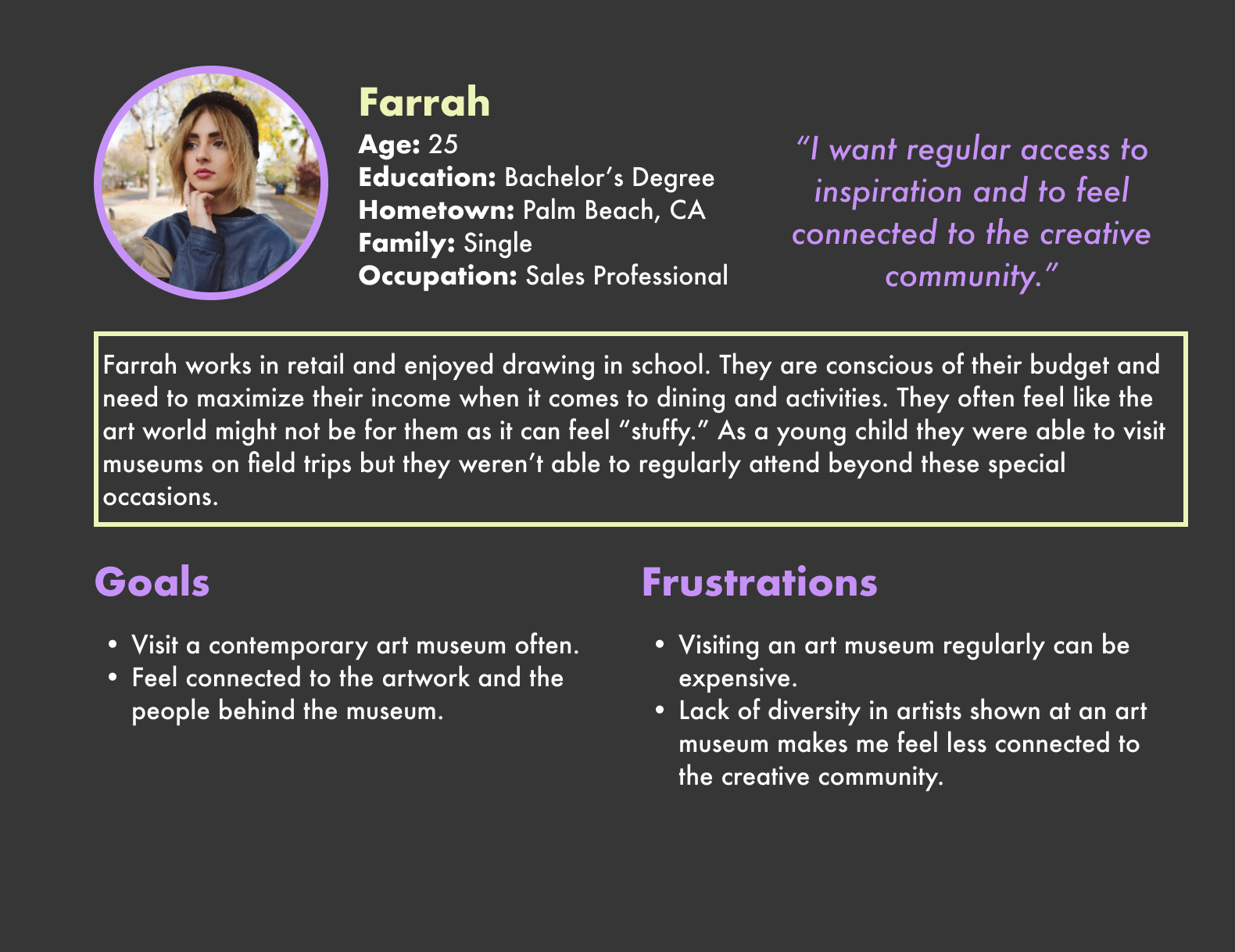 Farrah is a young professional interested in regularly visiting art museums without spending too much money. She also wants the artwork to represent the diversity of the art community and for the museum to be supported by leaders committed to equitable access to art.