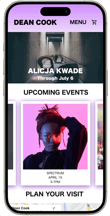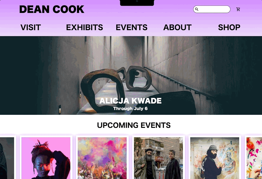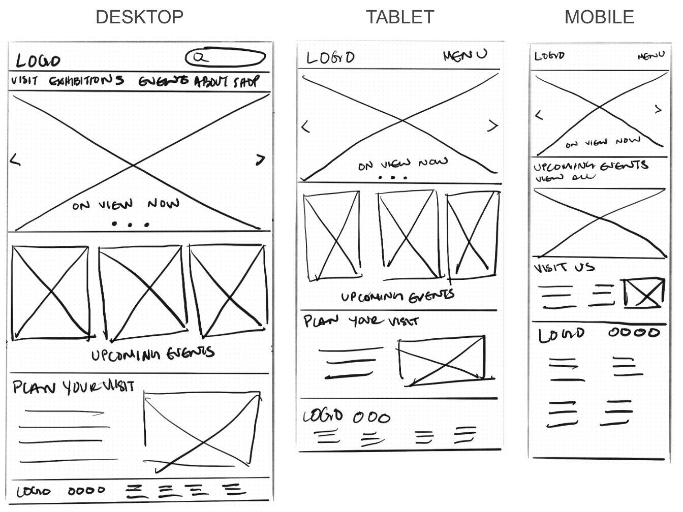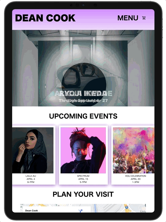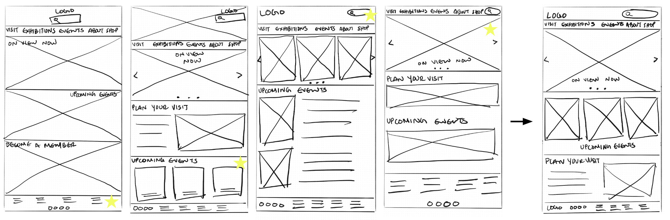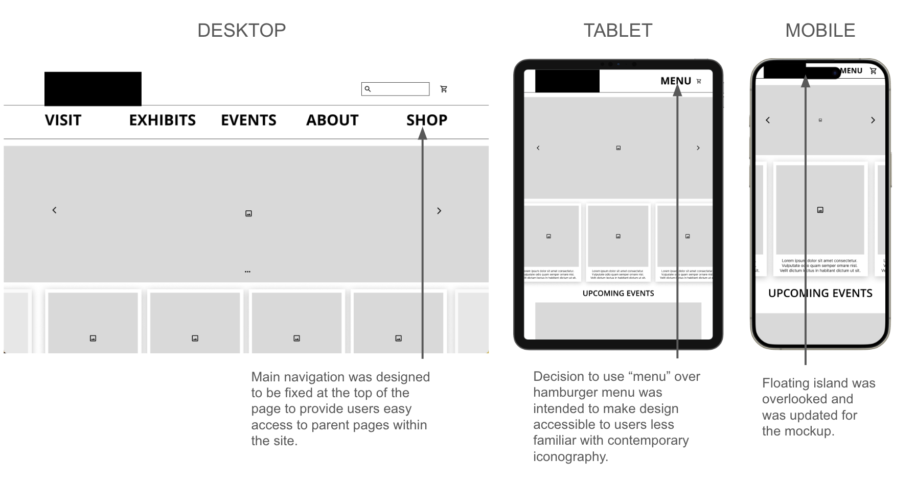 In the next iteration of our responsive website, we will prioritize a design that offers a better experience for smaller mobile screens. This will include making it easier for users to “checkout” and book their tickets. Additionally, we will re-think how we might better provide the information users are looking for on the homepage and revisit how the “EXHIBITS” and “EVENTS” are presented to the user.