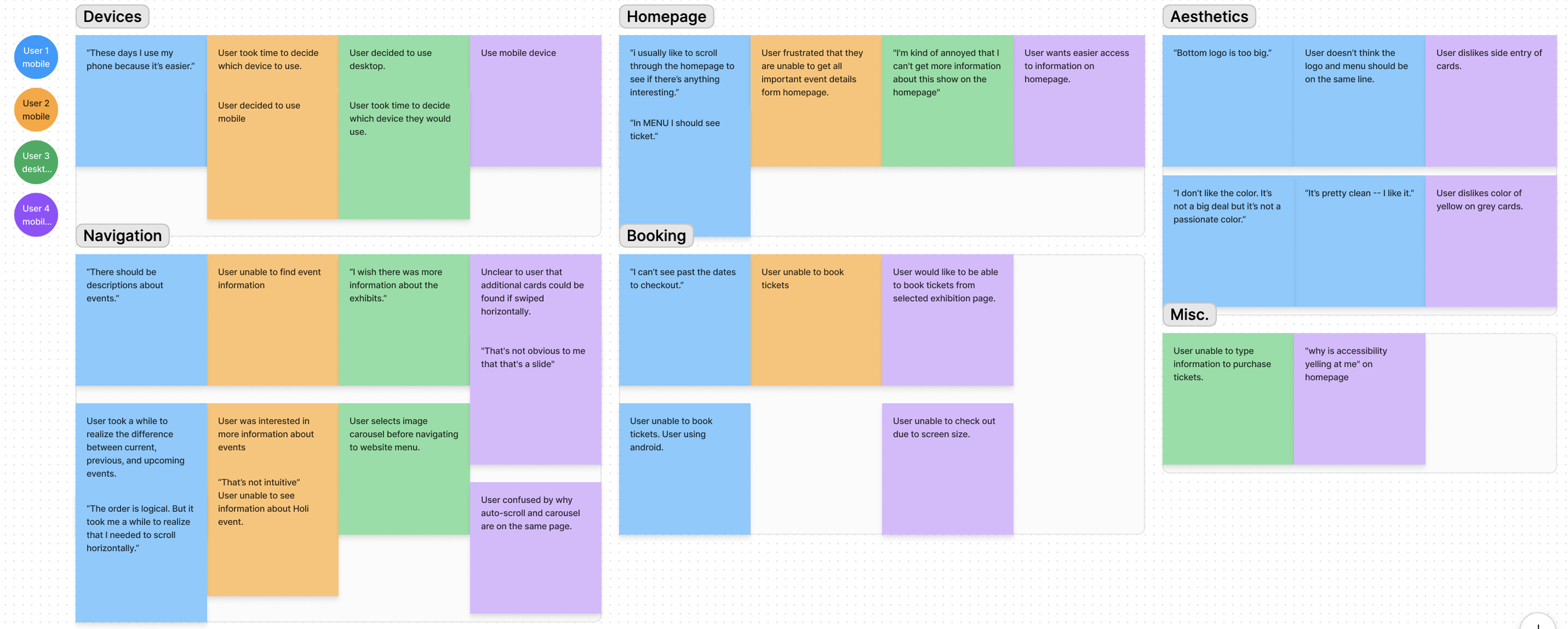 2) Navigation: 4 of 4 users struggled with navigating the “EXHIBITS” and “EVENTS” carousels. This means the design for the “EXHIBITS” and “EVENTS” sections need to be re-iterated so that users can easily find the information they are looking for.